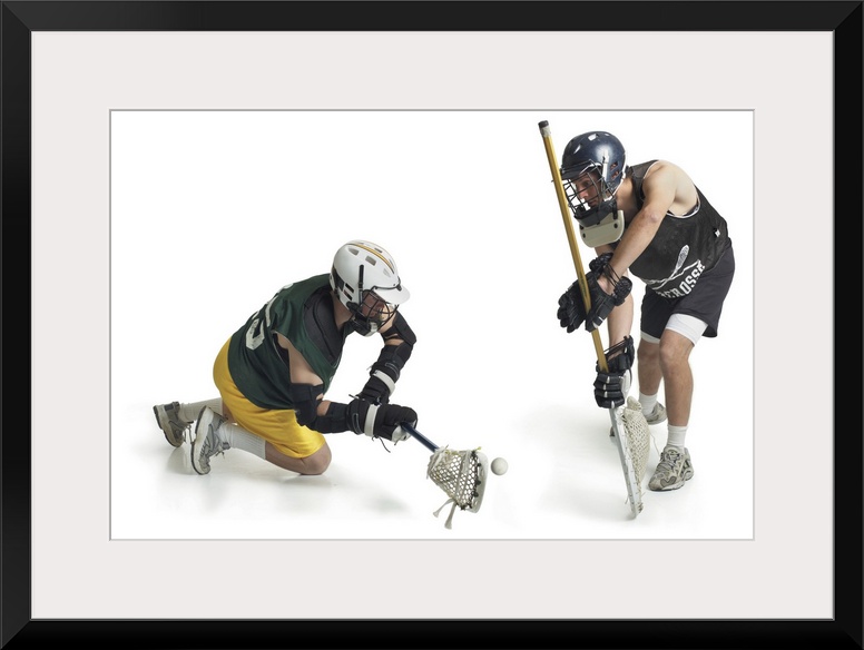 <p>two caucasian male lacrosse players from opposing teams confront each other as one steals a pass from the other</p>