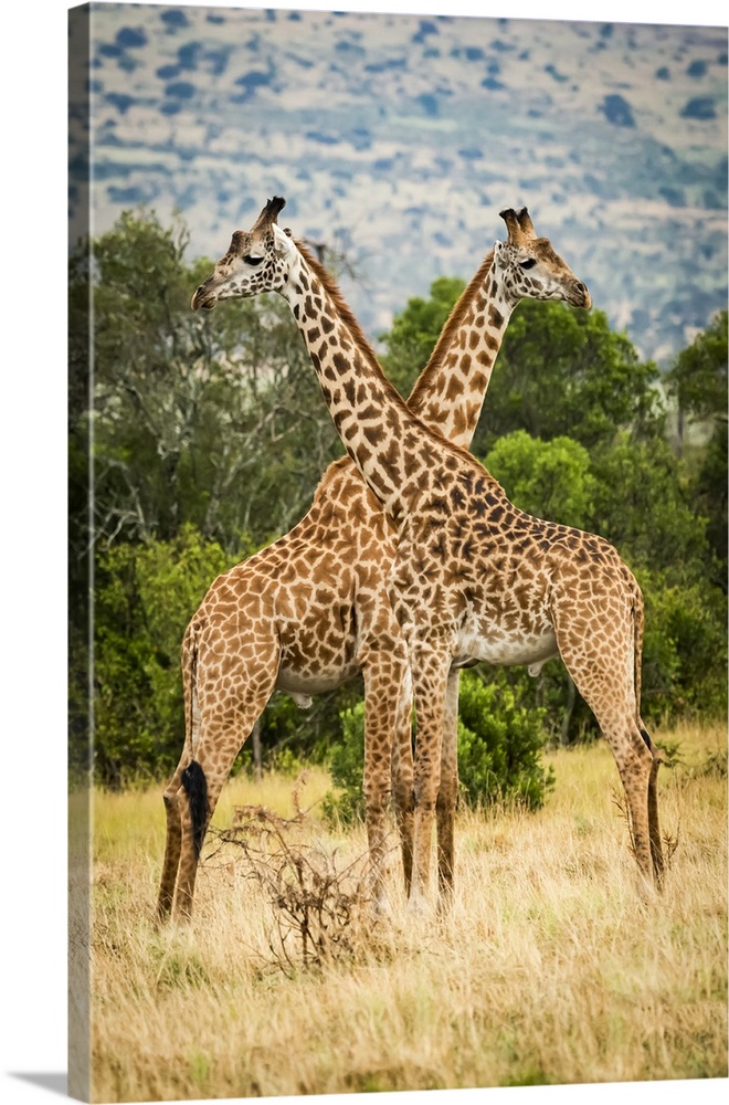 <p>Two Masai giraffe (Giraffa camelopardalis tippelskirchii) crossing necks by trees, Serengeti; Tanzania</p>
