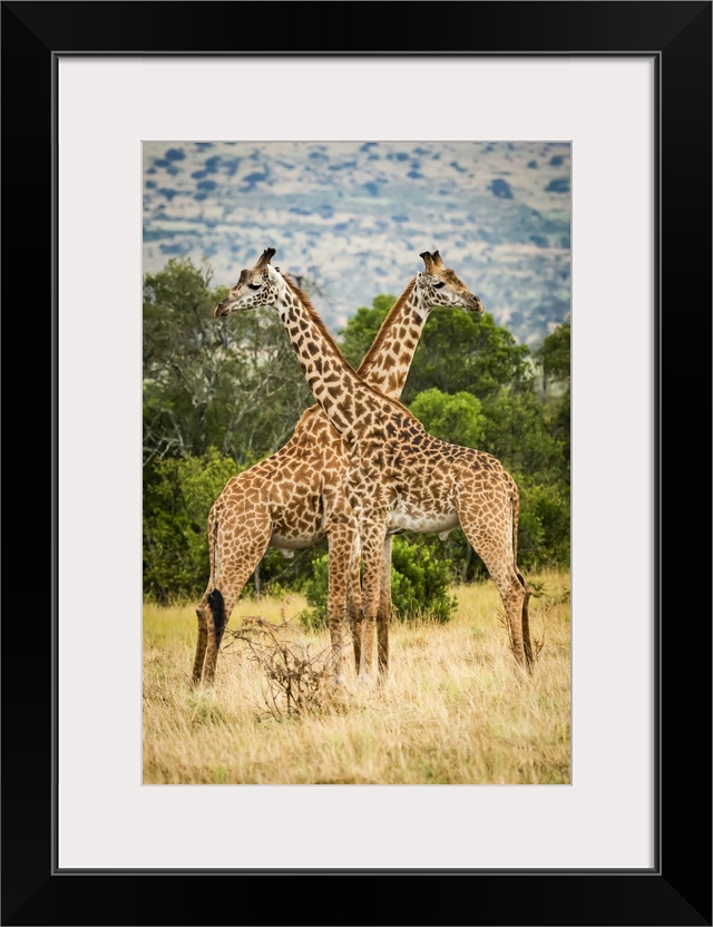 <p>Two Masai giraffe (Giraffa camelopardalis tippelskirchii) crossing necks by trees, Serengeti; Tanzania</p>