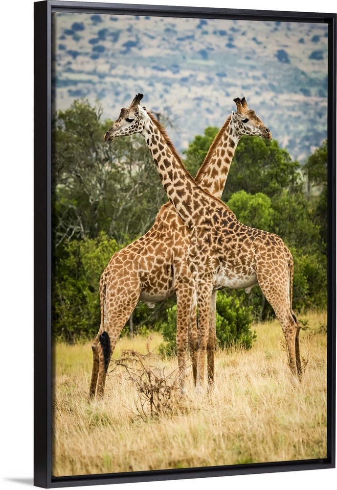 <p>Two Masai giraffe (Giraffa camelopardalis tippelskirchii) crossing necks by trees, Serengeti; Tanzania</p>