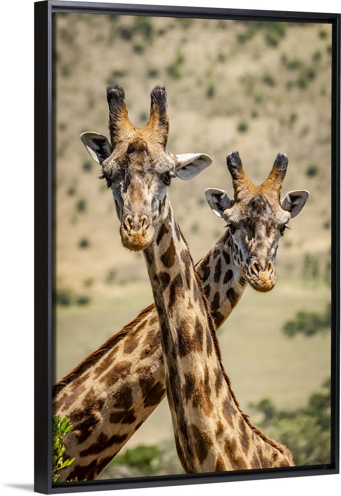 <p>Close-up of two Masai giraffe (Giraffa camelopardalis tippelskirchii) crossing necks, Serengeti; Tanzania</p>