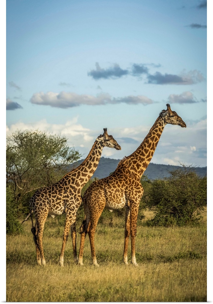 <p>Two Masai giraffe (Giraffa camelopardalis tippelskirchii) stand in golden light, Grumeti Serengeti Tented Camp, Serengeti National Park; Tanzania</p>