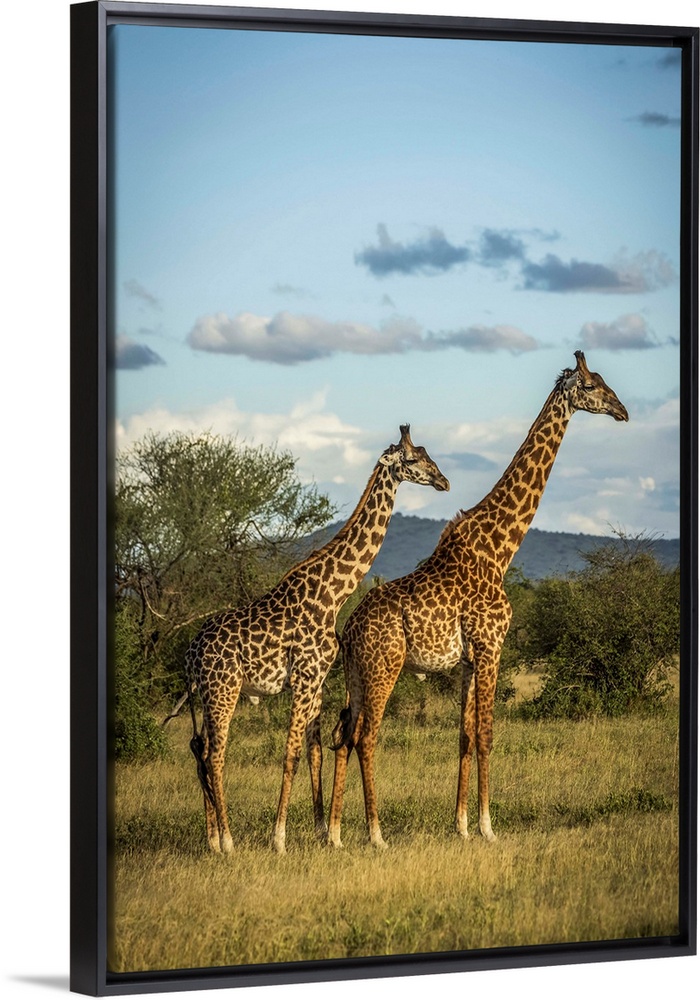 <p>Two Masai giraffe (Giraffa camelopardalis tippelskirchii) stand in golden light, Grumeti Serengeti Tented Camp, Serengeti National Park; Tanzania</p>