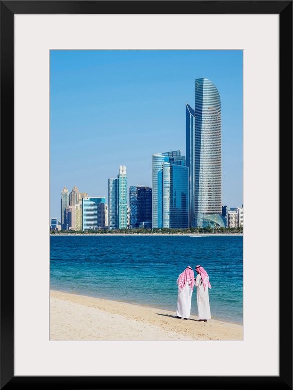 <p>Two Men Wearing Thawb On The Beach And City Center Skyline, Abu Dhabi, United Arab Emirates</p>