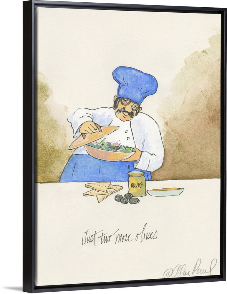 <p>Watercolor painting with pen and ink details of a chef making a salad titled Two More Olives by Alan Paul.</p>