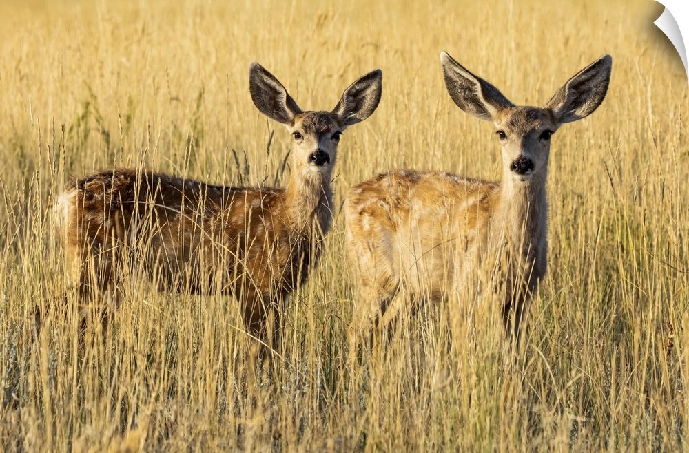 <p>Two Mule deer fawns (Odocoileus hemionus) standing in golden grass; Steamboat Springs, Colorado, United States of America</p>
