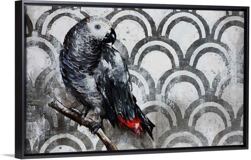 <p>Contemporary painting of a black and red bird perched on a small branch, in front of a neutral background with a contrasting geometric pattern.</p>