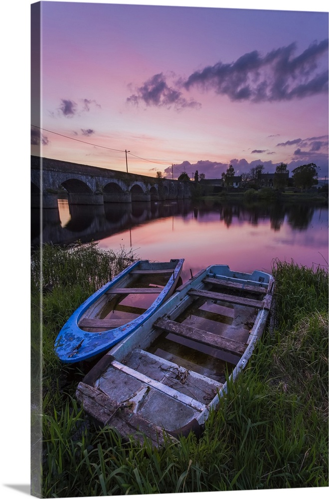 <p>Two old wooden boats on the banks of the Shannon River at sunset with a stone bridge in the background; Montpellier, County Limerick, Ireland.</p>