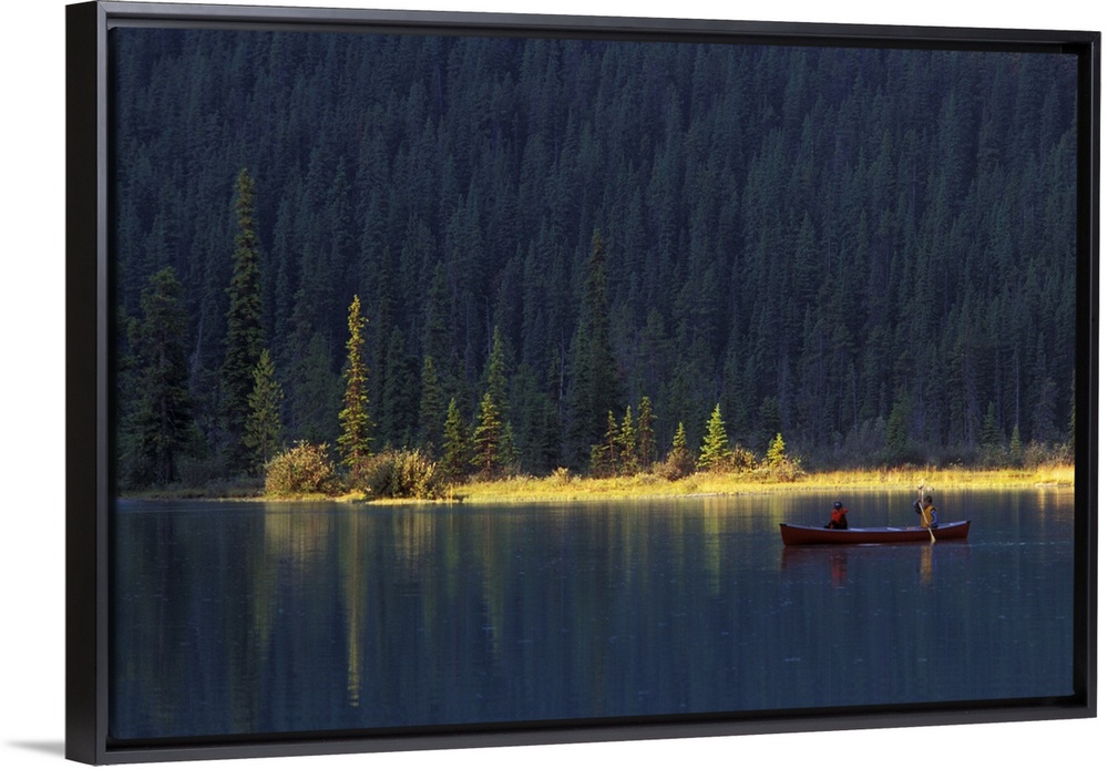 <p>Two people paddle in a canoe in the early morning light, with lush forest behind them, on Waterfowl Lake, in Banff National Park, in Canada.</p>