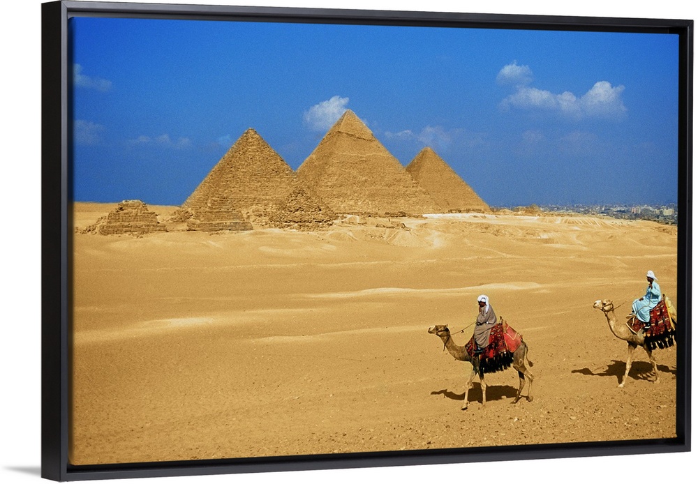 <p>Two people riding camels near the pyramids of Giza, Egypt</p>