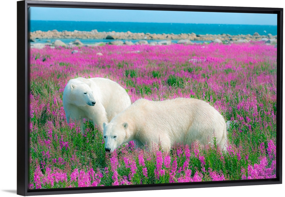 <p>Two Polar Bears near the Hudson Bay Coast, Manitoba, Canada, looking for a resting spot in a field of pink fireweed flowers covering a small island.</p>