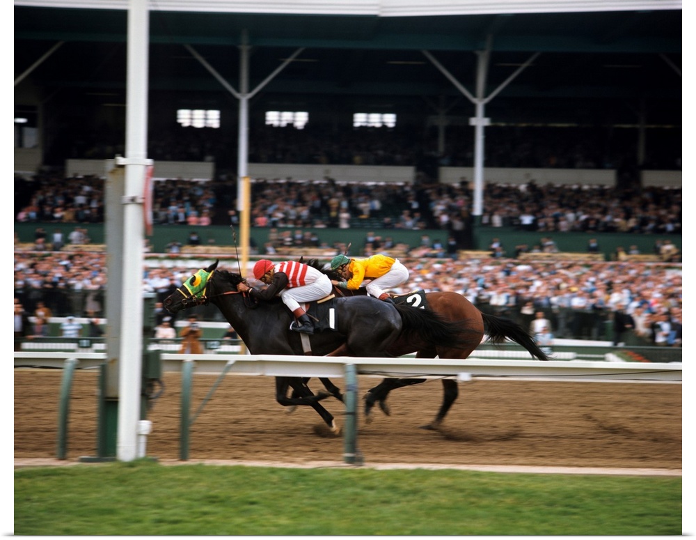 <p>Two race horses and jockeys neck and neck going to the finish line.</p>