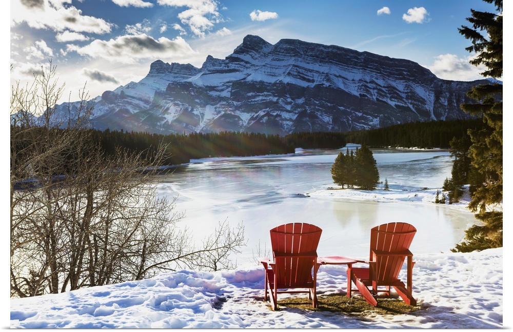<p>Two Red Chairs On Snow Covered Ridge Overlooking Frozen Lake, Banff, Alberta, Canada</p>