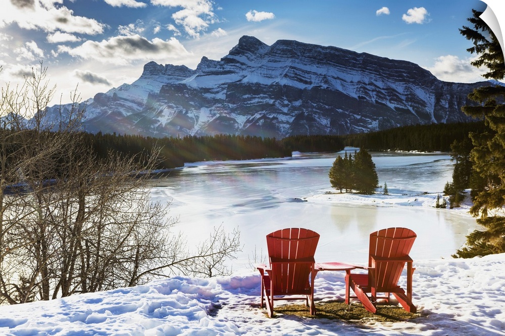 <p>Two Red Chairs On Snow Covered Ridge Overlooking Frozen Lake, Banff, Alberta, Canada</p>