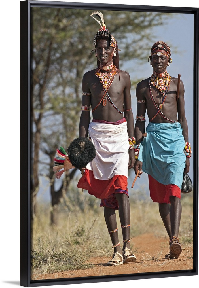 <p>Two Samburu warrior of Northern Kenya in all their finery. The ostrich pompom on the spear was formerly a sign of peace.</p>