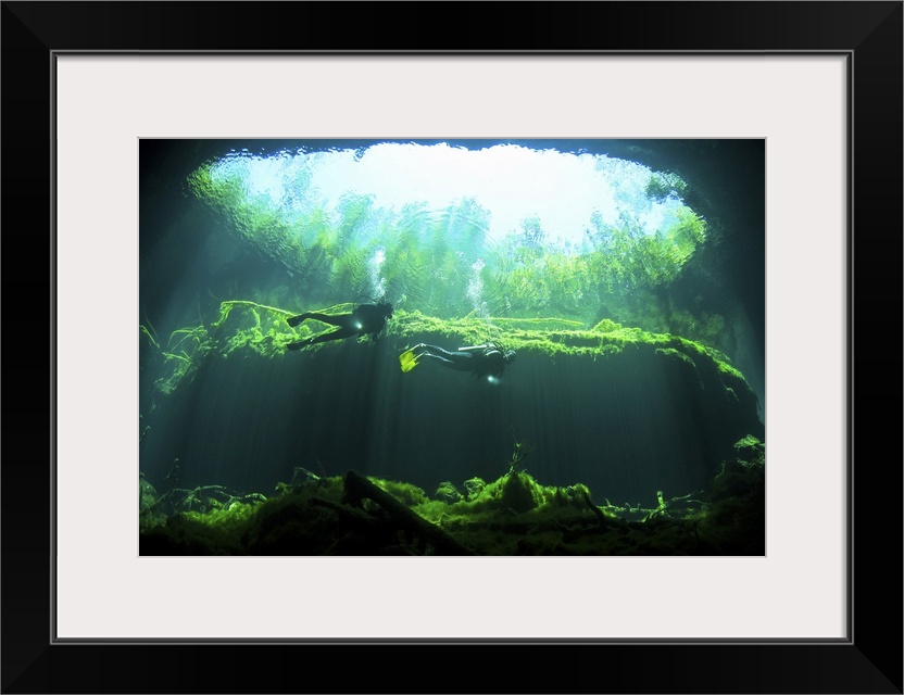 <p>Two scuba divers in the Garden of Eden cavern part of the cenote system on the Yucatan Peninsula of Mexico.</p>