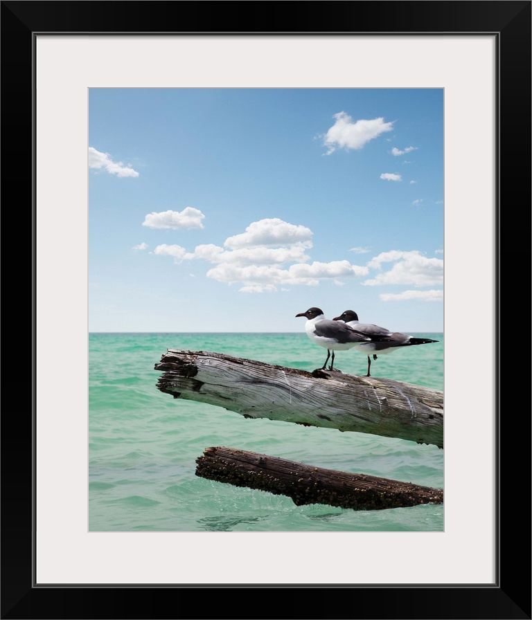 <p>Two seagulls sitting on a dead tree sticking out of the water on location at Sarasota Florida for Vacation, Freedom, Carefree, Summer Time, Adventure, Companionship, Togetherness, Escape</p>