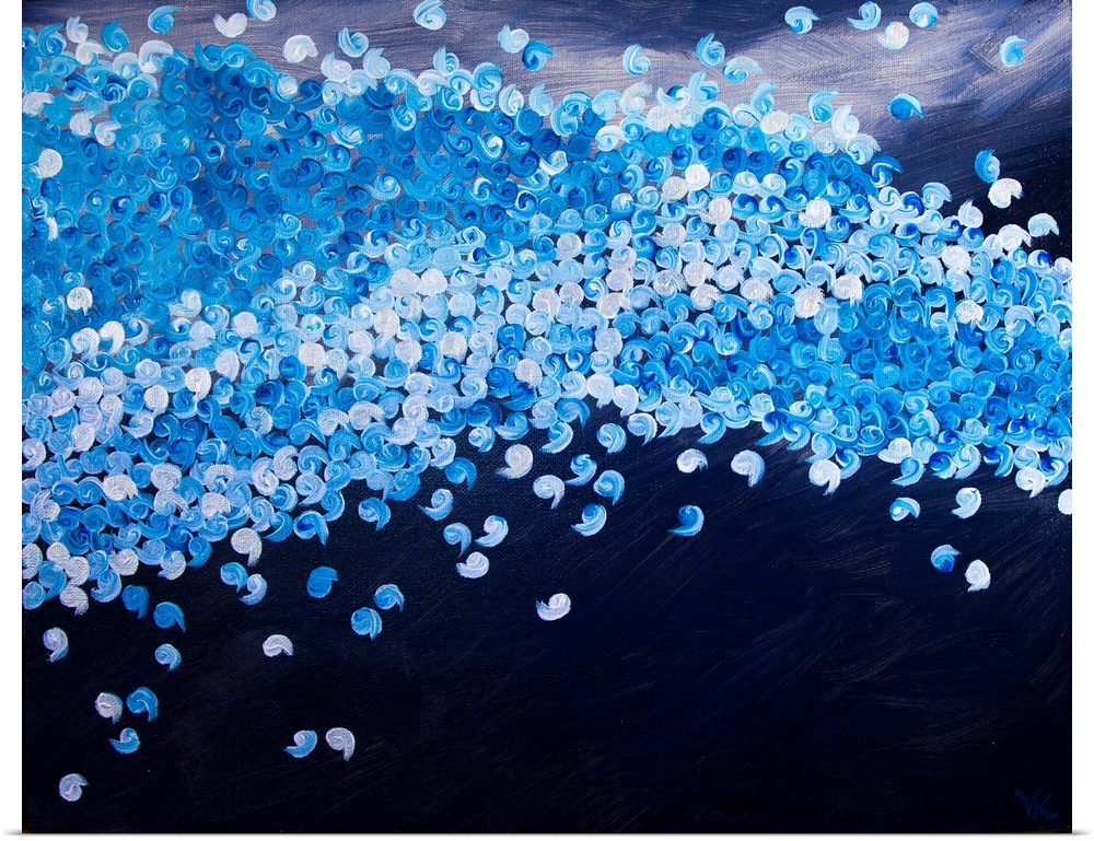 <p>Painting of blue, white and silver flying apostrophes floating on a navy background.</p>