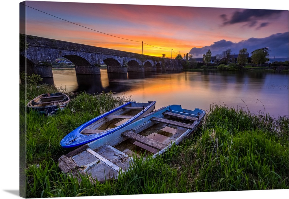 <p>Two small wooden boats on the bank of the Shannon river in front of a stone bridge at sunset in summer; O'Brien's Bridge, County Clare, Ireland.</p>