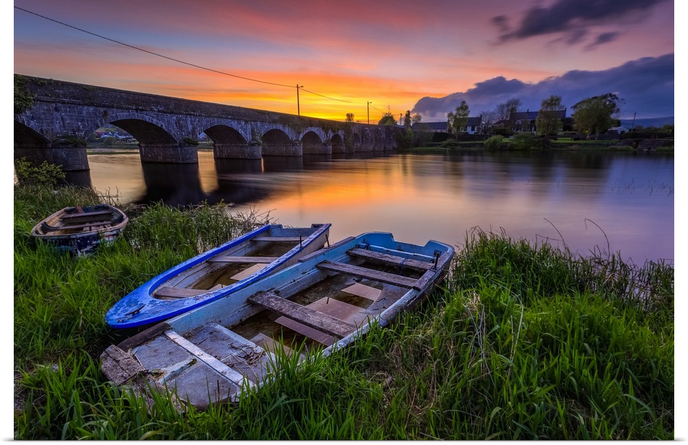 <p>Two small wooden boats on the bank of the Shannon river in front of a stone bridge at sunset in summer; O'Brien's Bridge, County Clare, Ireland.</p>