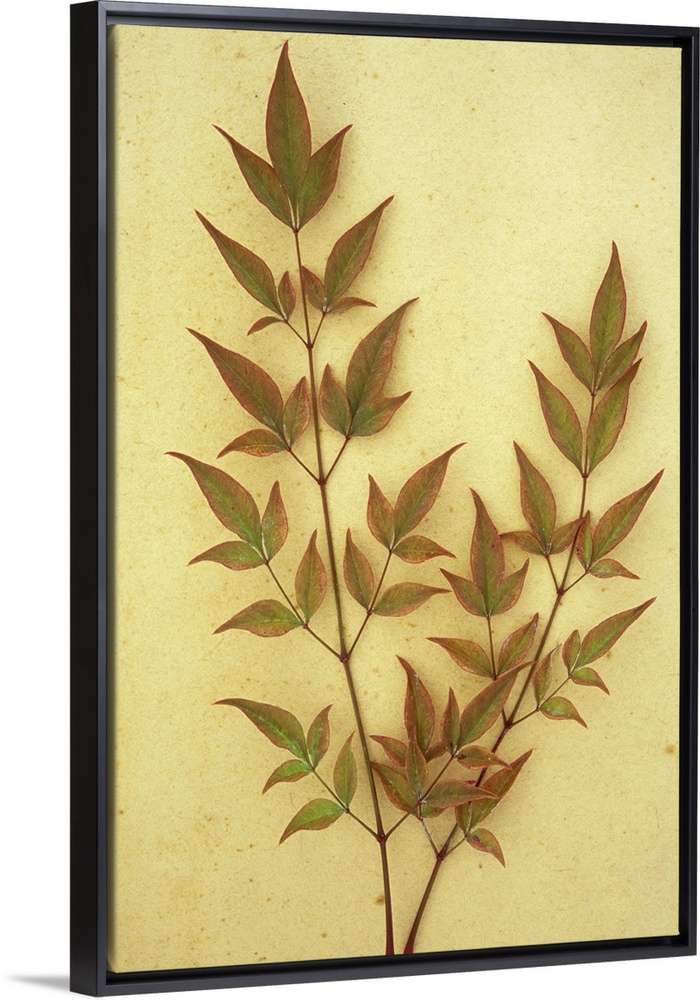 <p>Two sprays of red leaves tinged with green of evergreen shrub Heavenly bamboo or Nandina domestica lying on antique paper</p>