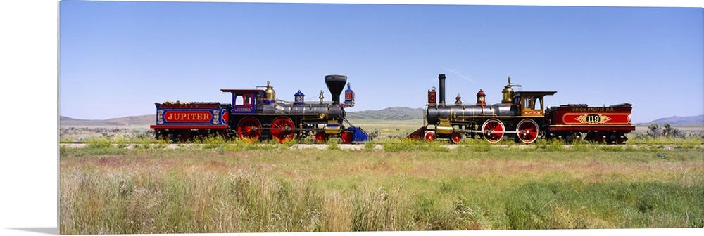 <p>Two restored trains facing one another on opposite rails at Promontory Summit in Utah.</p>