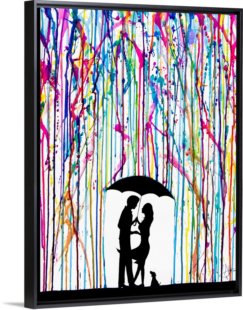 <p>Watercolor and ink painting of a couple and a dog under an umbrella under colorful rain.</p>