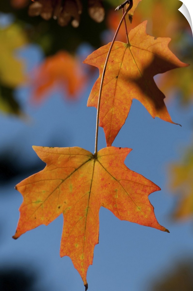 <p>Closeup of two sugar maple leaves in autumn colors. Concord , Minuteman National Historical Park, Massachusetts</p>