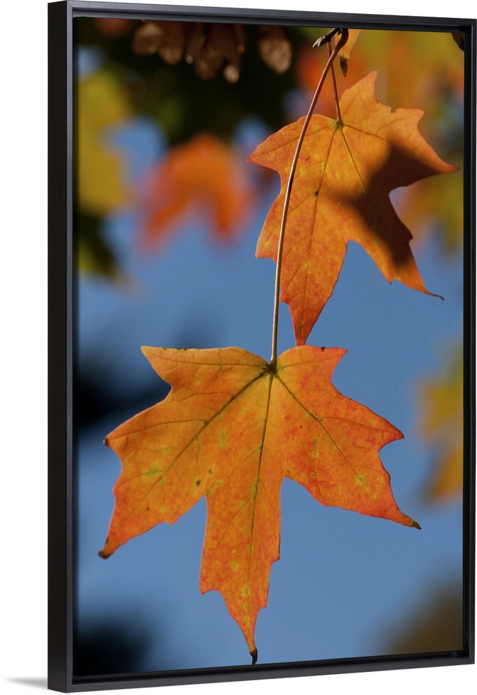 <p>Closeup of two sugar maple leaves in autumn colors. Concord , Minuteman National Historical Park, Massachusetts</p>