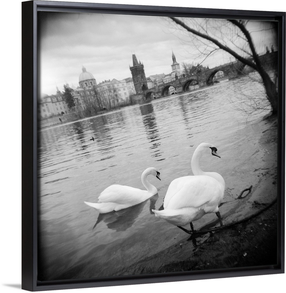 <p>Two swans in a river, Vltava River, Prague, Czech Republic</p>