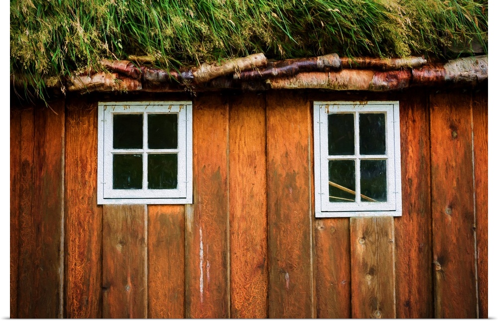 <p>Two little windows in a wooden wall with a grassy roof.</p>