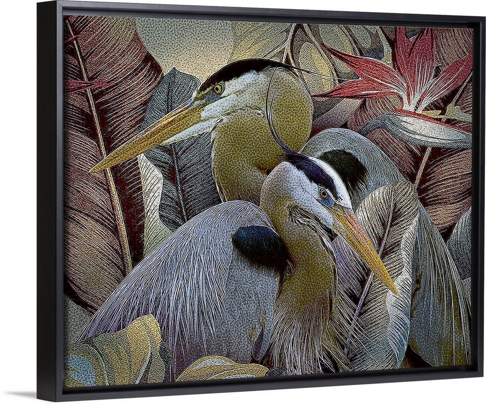 <p>Two herons sitting together amongst tropical leaves and flowers.</p>