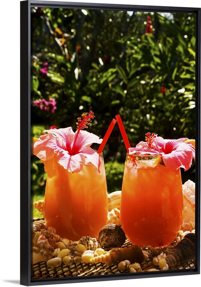 <p>Two tropical drinks garnished with flowers in an outdoor setting.</p>