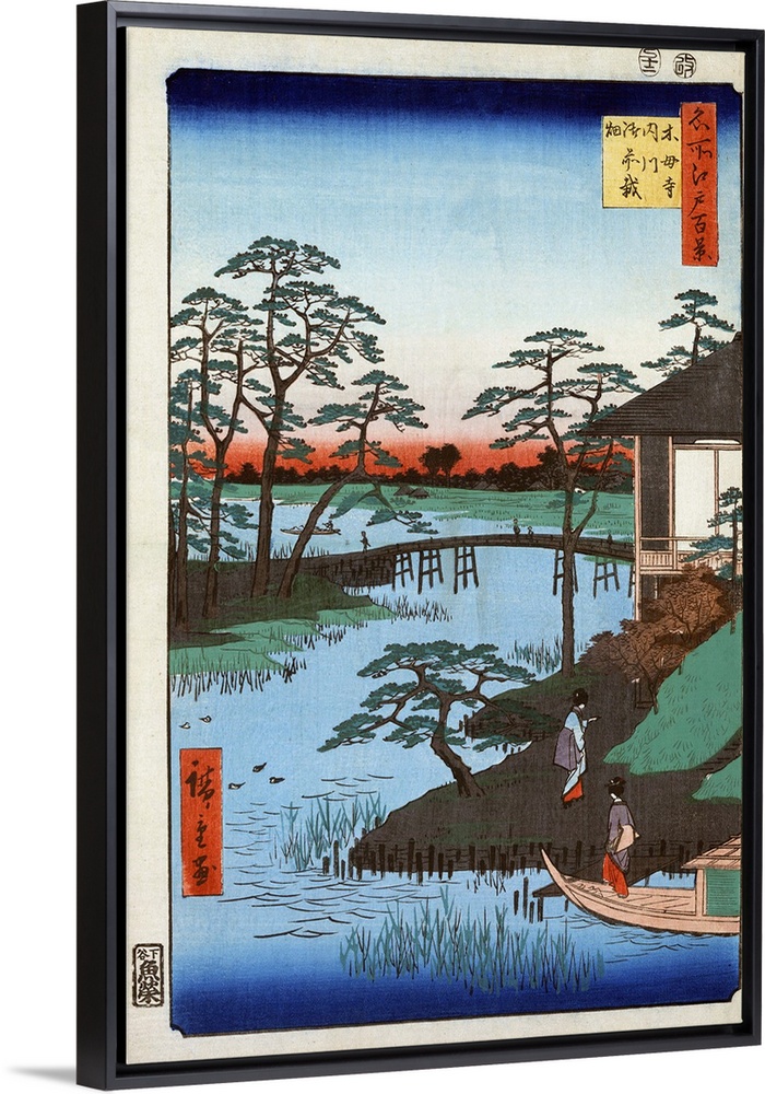 <p>Japan, Inlet, 1857. Two Women Approaching A Temple Building On the Uchigawa Inlet In Tokyo, Japan, Next To the Gozensaihata Gardens. Woodblock Print By Ando Hiroshige, 1857.</p>