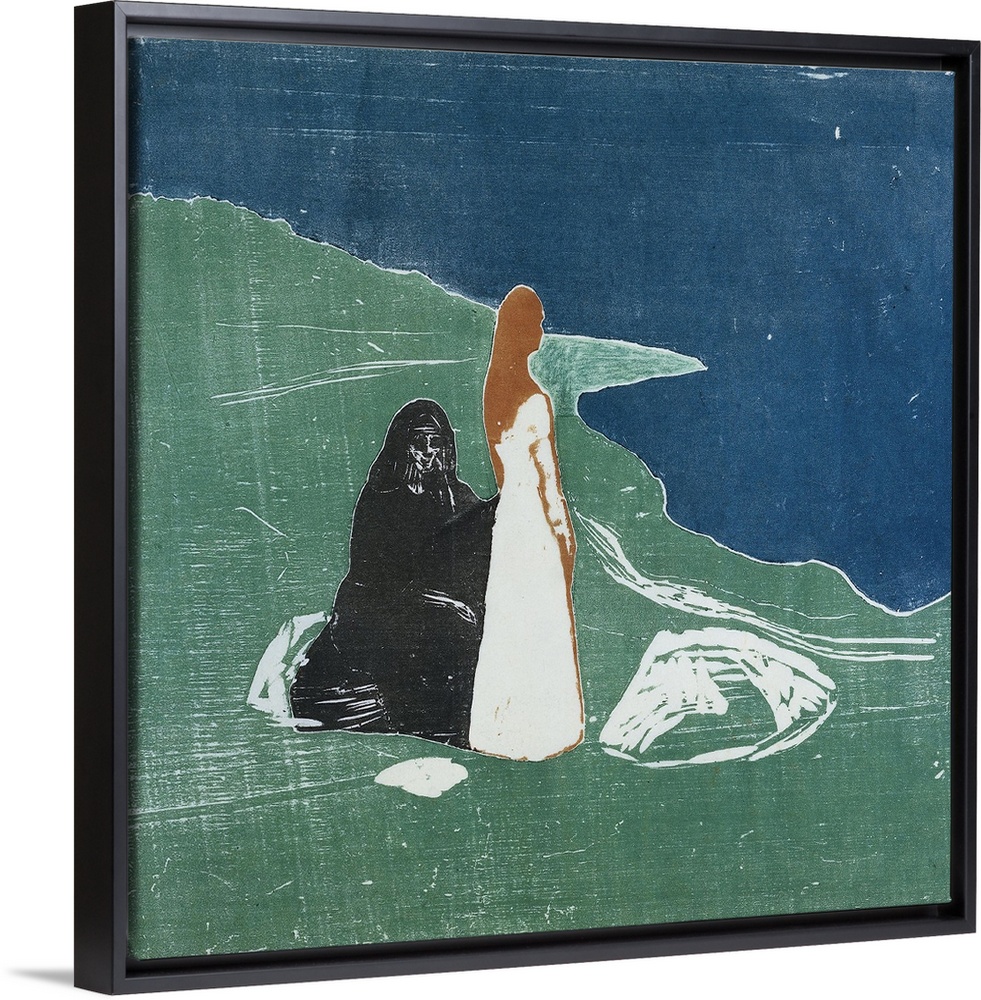 <p>Two Women at the Seashore, by Edvard Munch, 1898, Norwegian print, color woodcut. A young woman in white looks into the sea, while the old women in black looks away.</p>