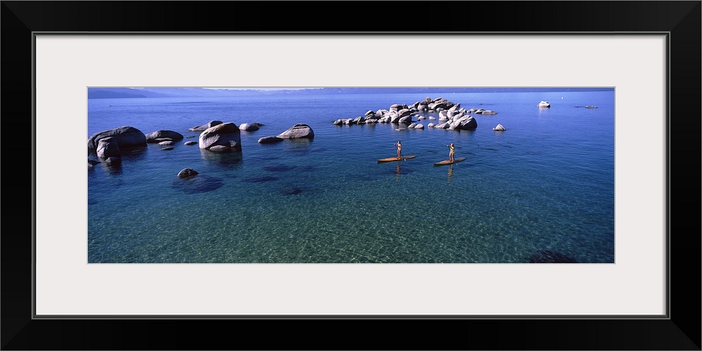 <p>Two women paddle boarding in a lake, Lake Tahoe, California, USA</p>