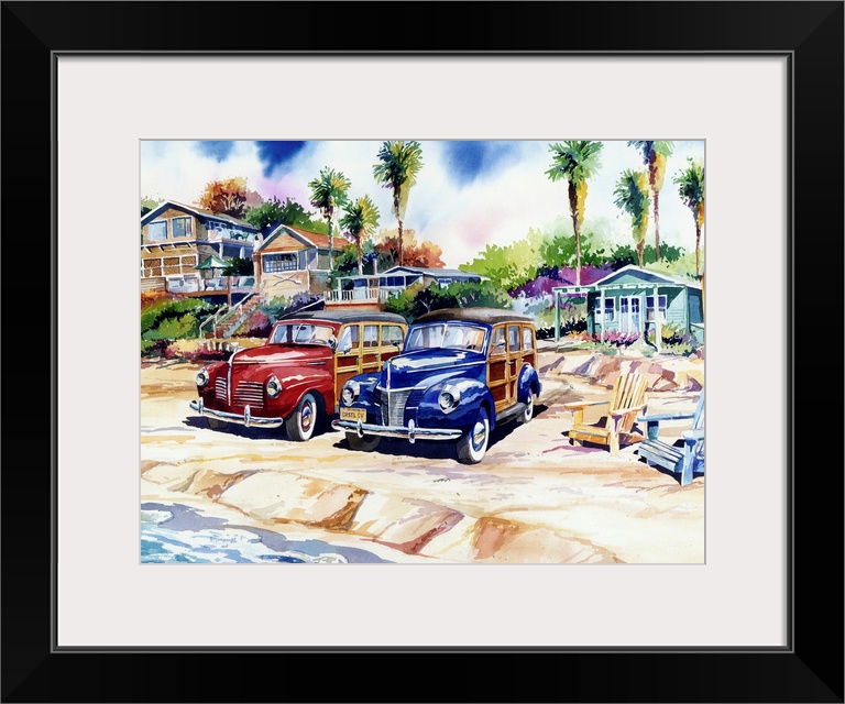 <p>Watercolor of two woodies on the beach at Crystal Cove, Laguna Beach, California.</p>