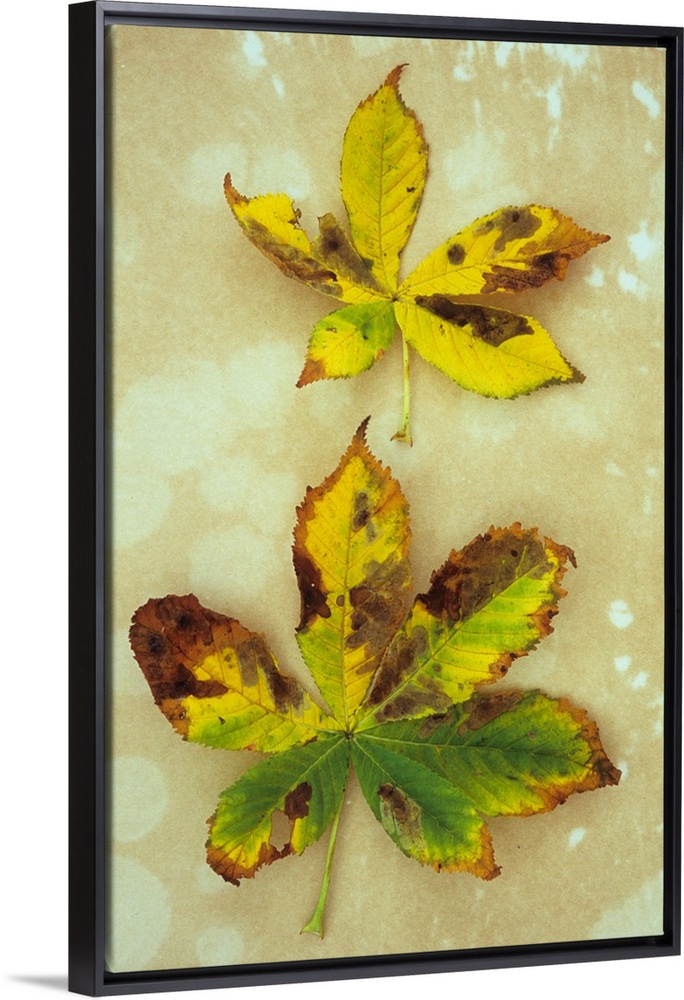 <p>Two yellow brown and green autumn leaves of Horse chestnut or Aesculus hippocastanum tree lying on antique paper</p>