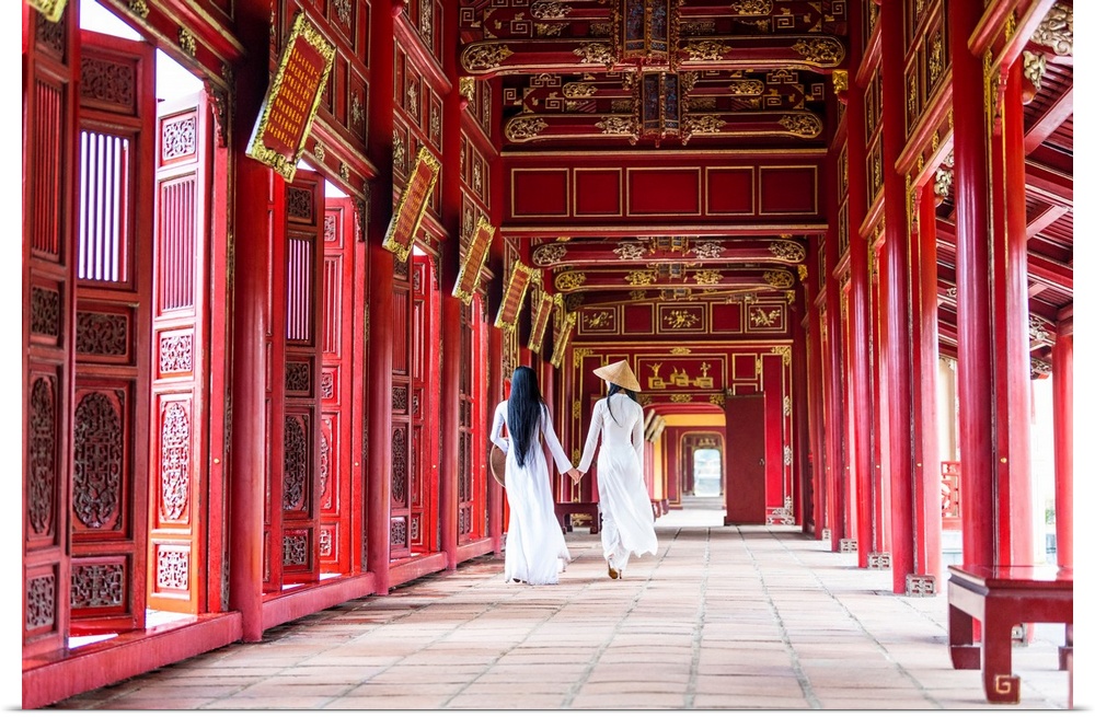 <p>Two young women wearing traditional national costume, ao dai, in the Imperial City, Hue, Vietnam.</p>