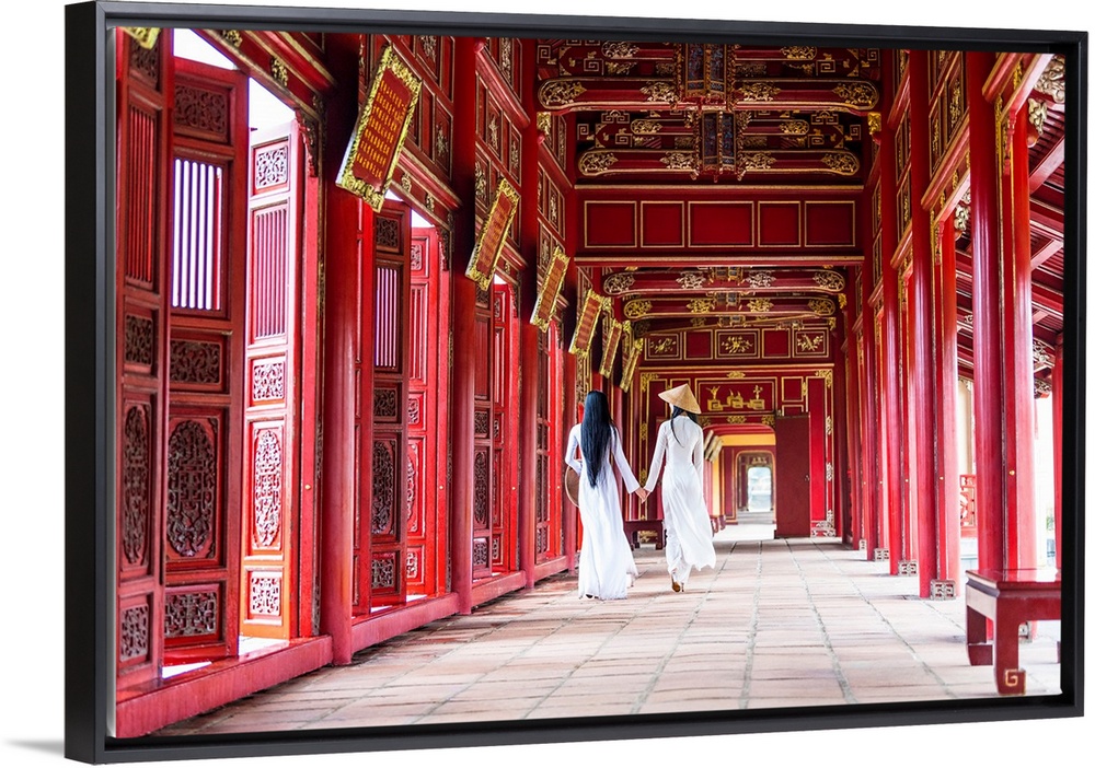 <p>Two young women wearing traditional national costume, ao dai, in the Imperial City, Hue, Vietnam.</p>