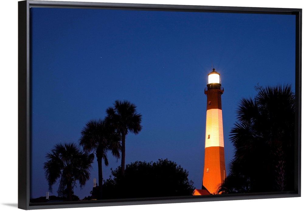 <p>USA, Georgia, Tybee Island, Palmetto Palm trees and Tybee Lighthouse at dusk on summer evening</p>
