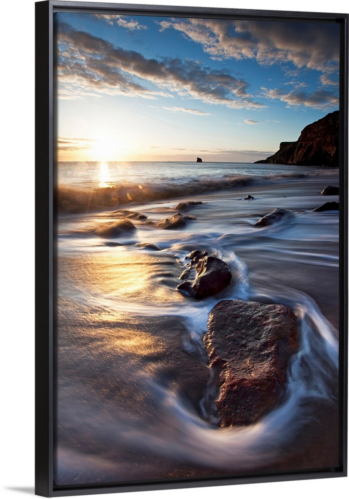 <p>Vertical photograph on a large canvas of the sun rising over waters rushing onto a rocky beach, in Tyneside, Northern England.</p>