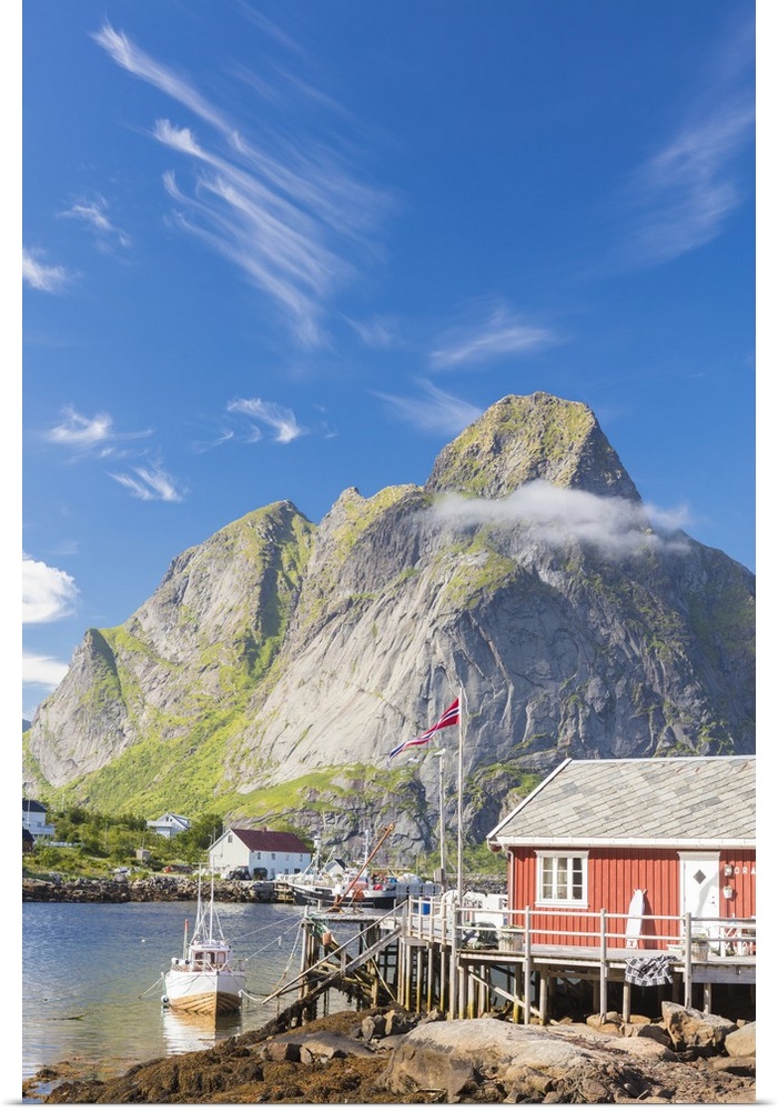 <p>Typical house of fishermen called Rorbu framed by rocky peaks and blue sea, Reine, Moskenesoya, Lofoten Islands, Norway, Scandinavia, Europe</p>