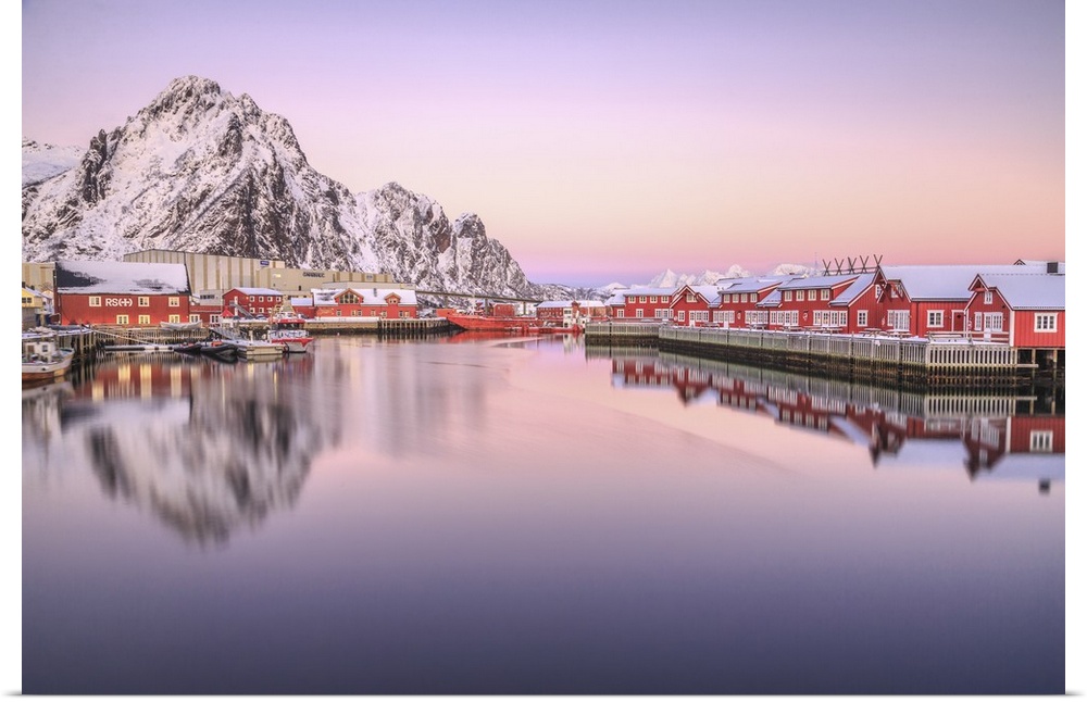 <p>Pink sunset over the typical red houses reflected in the sea. Svollvaer Lofoten Islands Norway Europe.</p>