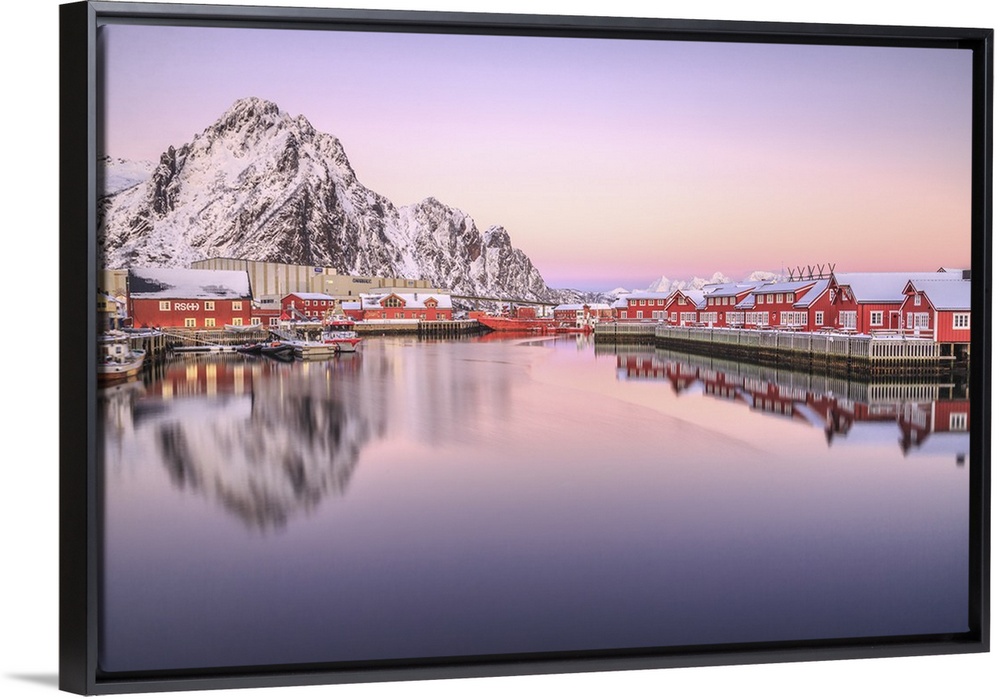 <p>Pink sunset over the typical red houses reflected in the sea. Svollvaer Lofoten Islands Norway Europe.</p>