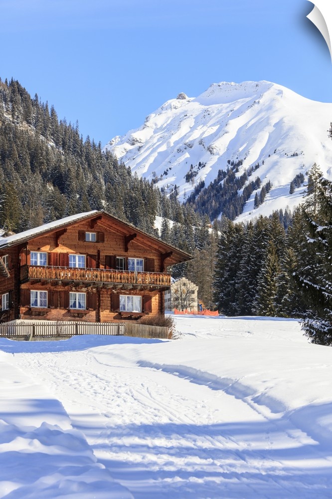 <p>Typical wooden hut framed by woods and snowy peaks, Langwies, district of Plessur, Canton of Graubunden, Swiss Alps, Switzerland, Europe</p>