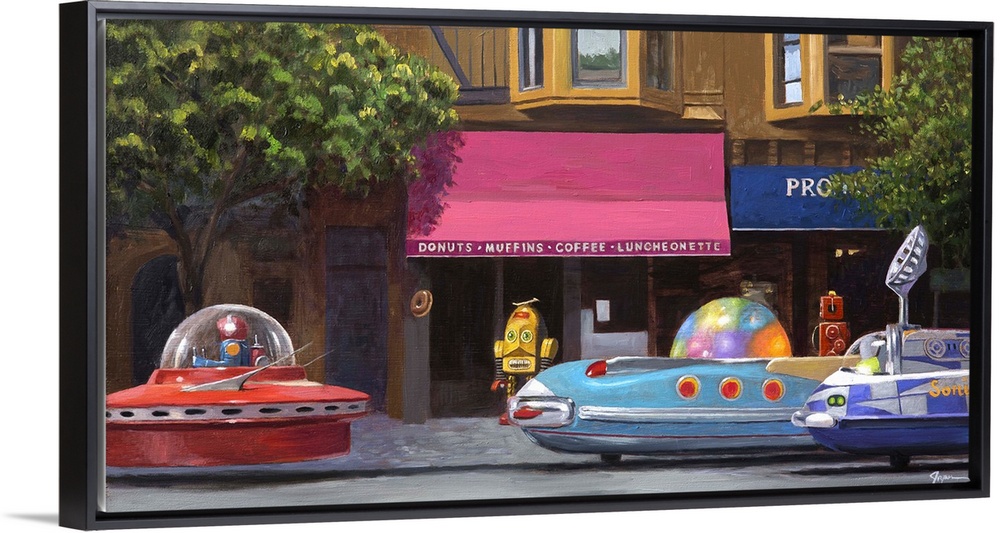 <p>A contemporary painting of a city street scene with retro toy robots driving rocket ship cars.</p>