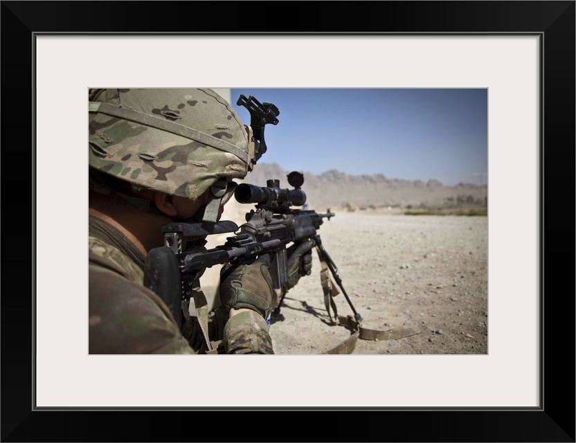 <p>May 30, 2011 - U.S. Army sniper pulls security down a dusty road with an Mk14 EBR sniper rifle during a combat patrol outside of Combat Operating Post 8-1, in downtown Kandahar City, Afghanistan. The objective of the mission is to set up tactical control points to search vehicles/occupants, and to gather atmospherics from the general population.</p>