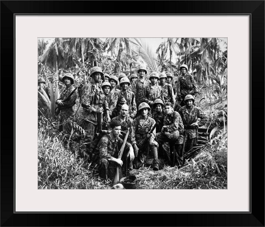 <p>U.S. Marine Raiders posing in front of a Japanese dugout which they helped capture at Cape Torokina, Bougainville, New Guinea, during World War II, January 1944.</p>