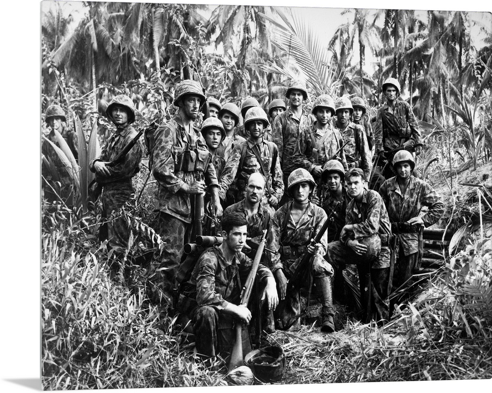 <p>U.S. Marine Raiders posing in front of a Japanese dugout which they helped capture at Cape Torokina, Bougainville, New Guinea, during World War II, January 1944.</p>